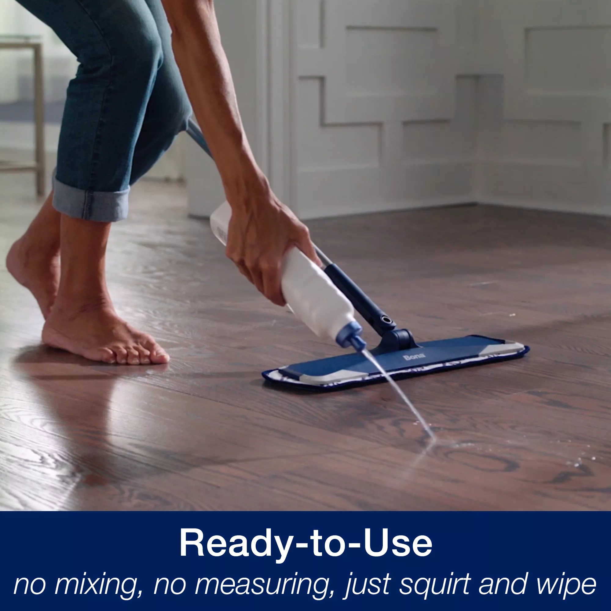 - Spray a wide, wavy line of wood floor polish on a small section of the floor. Using a Bona application pad, spread the product over the section in the direction of the wood for a smooth finish.