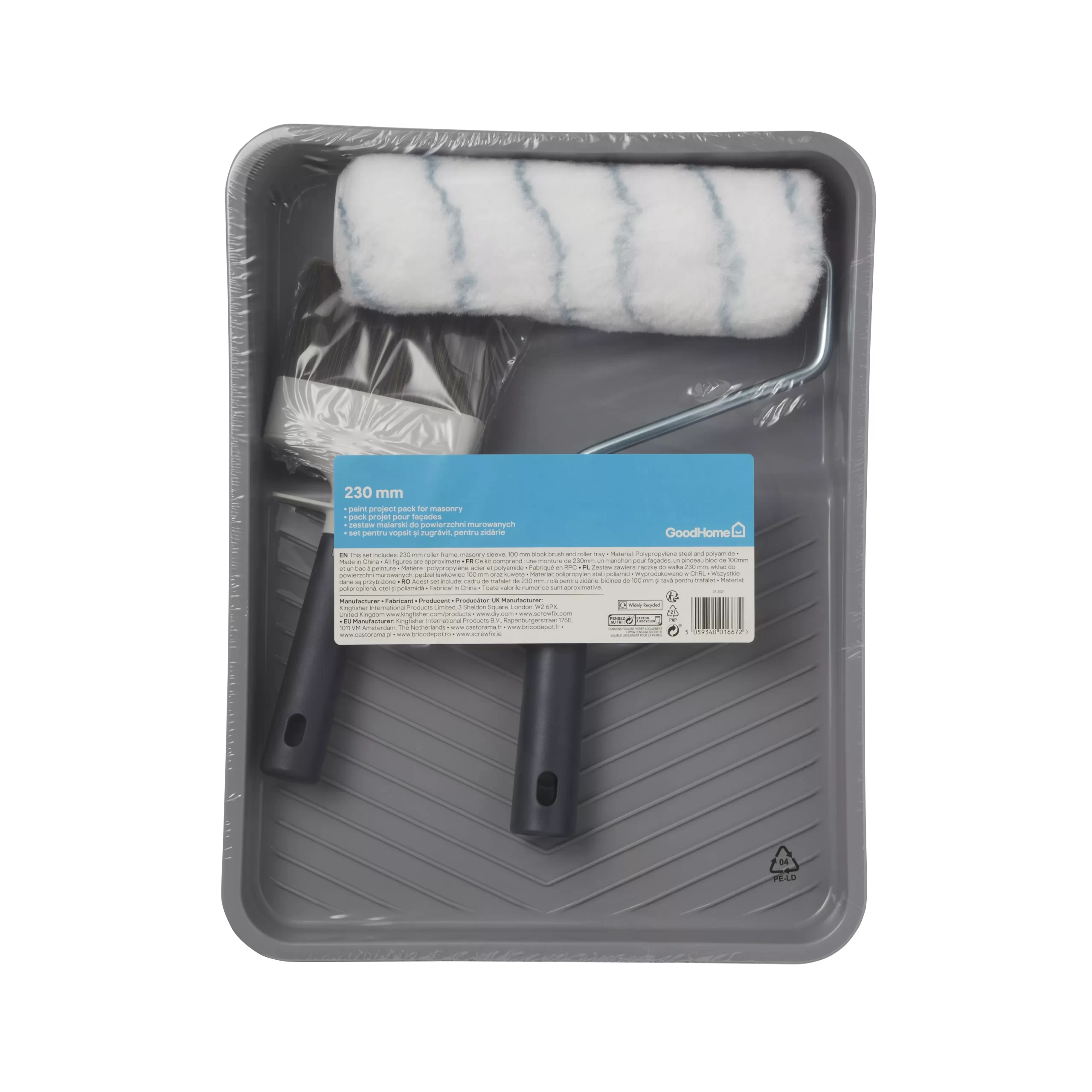 Paint interior or exterior walls and ceilings with our GoodHome masonry paint project pack. The roller frame and sleeve has the highest paint hold and release capacity of any of our rollers for the fastest work and best coverage, even on rough surfaces. It has a large 45mm core diameter for great paint holding capacity for fast work. When working at height, use with GoodHome extension poles for an easier reach.