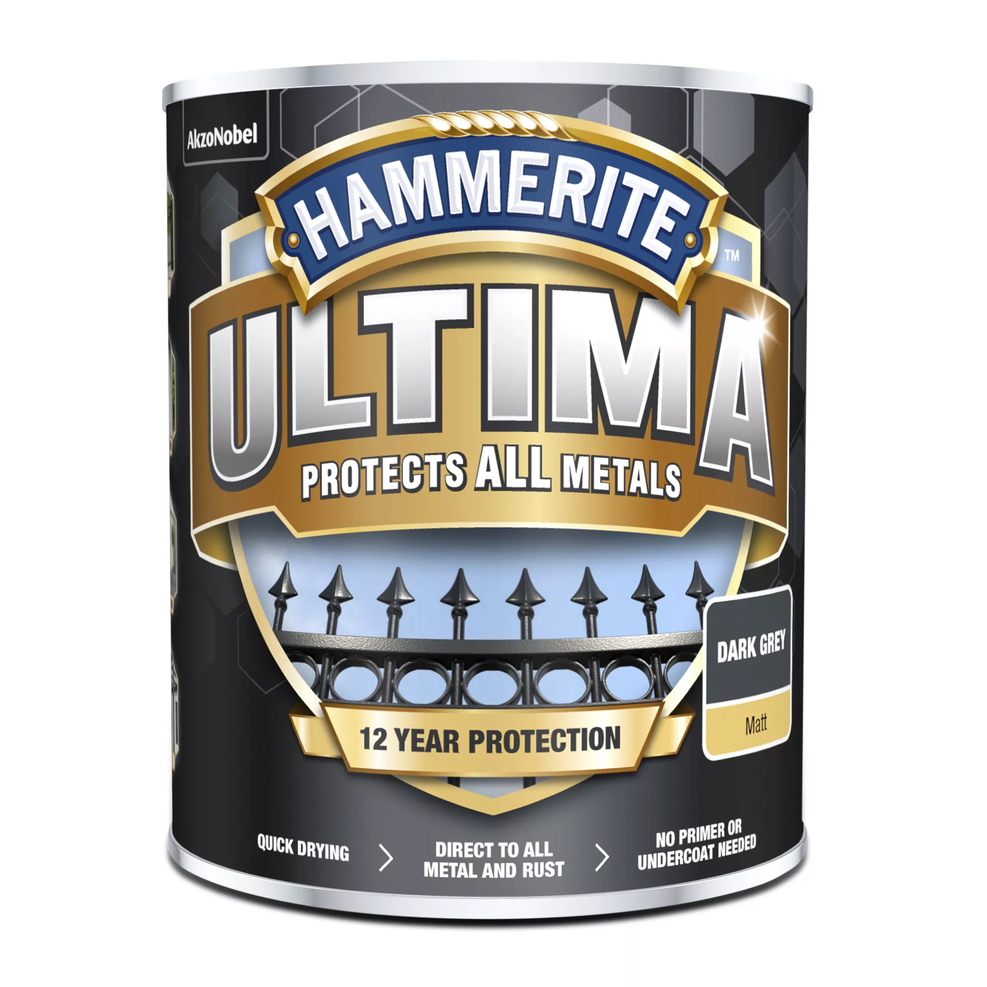 This matt metal paint from the Hammerite Ultima range is the perfect choice to refresh your home exterior. Made to provide a rich, durable finish on multi-surface, you can be sure that this paint will look brilliant for longer. Dark Grey is a stunning shade of grey that will suit any exterior design. The topcoat should be applied on any iron surfaces to create a consistent finish. Ensured to provide a long-lasting matt finish, this metal paint achieves a beautiful look, without compromising on quality. You can buy exactly what you need to complete your decorating job, as this 750ml size will cover up to 7.5 mΒ² on average. For the best outcome, apply using a brush. It will dry quickly between coats meaning you can recoat it in 4 hours. Resistant to water and rust, it’s suitable for use in your outdoor space. Furthermore, you can be assured that this water-based paint is safe for you in your home, as it has minimal VOCs.