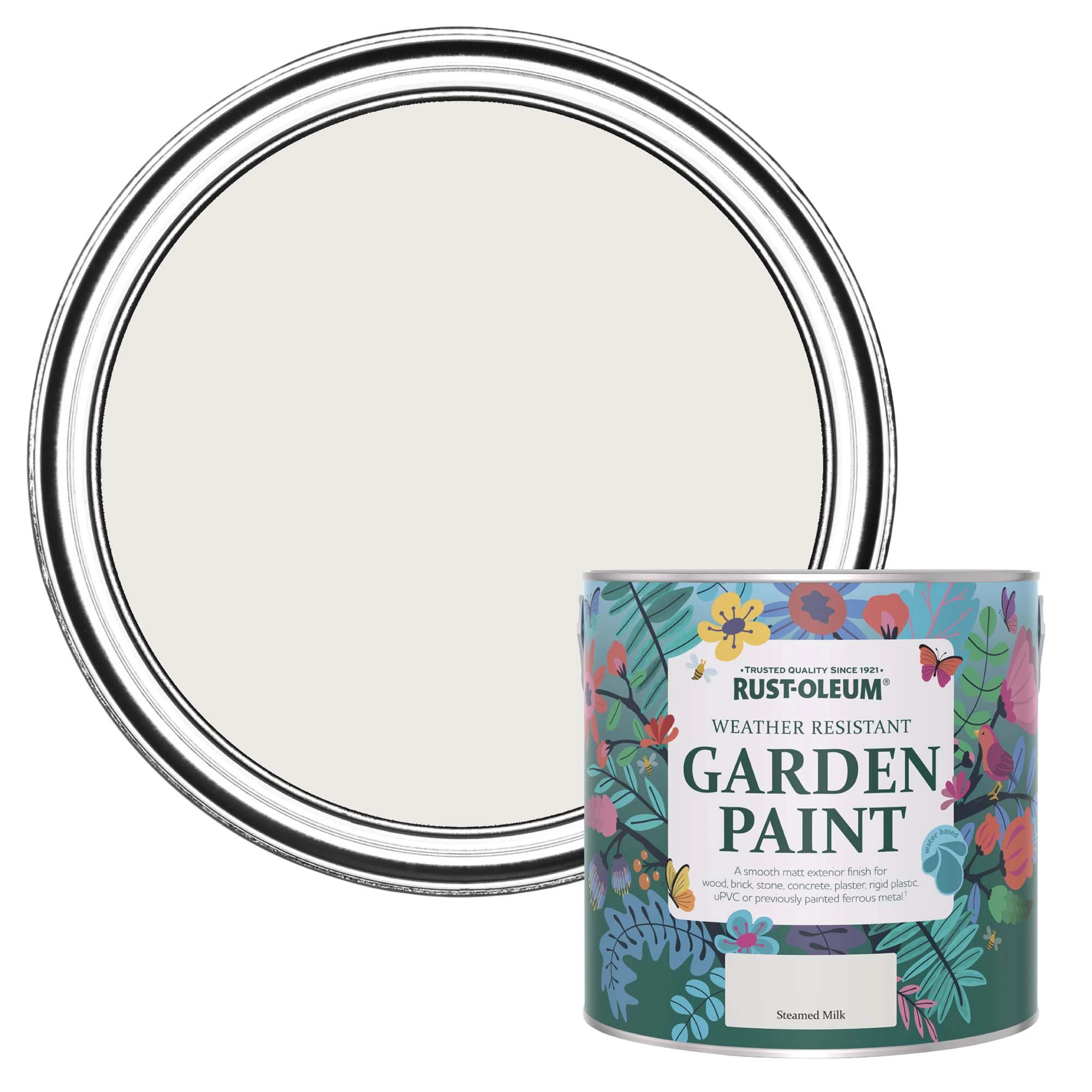 Bring your garden to life with the Garden Paint exterior matt paint from Rust-Oleum. It’s suitable for use on multi-surface, so you can rely on it for any project. Steamed Milk is a stunning shade of white that will suit any exterior design. The paint should ideally be used as a topcoat on brick, concrete, plaster, stone and wood. After application, this paint will achieve a flawlessly matt surface that will look good as new for a long time. You can buy exactly what you need to complete your decorating job, as this 2.5L tin will cover up to 35 mΒ² on average. For the best outcome, apply to a dry, dust-free, and grease-free surface using a brush or roller. This paint needs 2 coats to look its best, but its quick drying formula makes up for lost time, as you can recoat after just 2 hours. Made with protective technology, this paint is resistant to water and mould, allowing you to free yourself from the worries of everyday damage to your new surfaces. Not only that, but our paint is water-based, so itβs safe for you and your home.