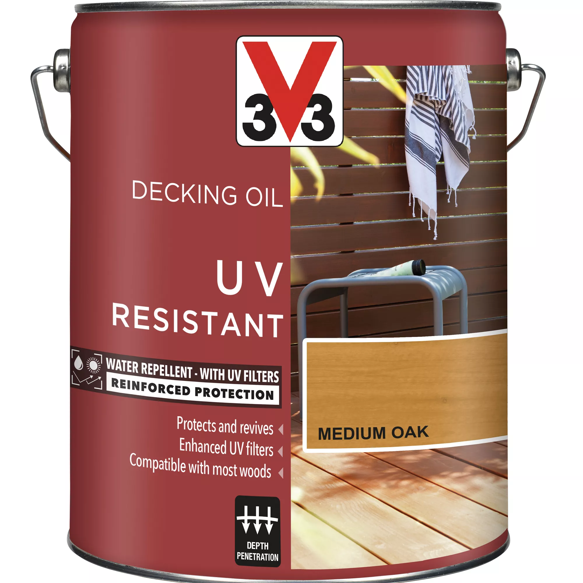 - Protect and transform decking with V33 UV resistant decking oil. This product is perfect for reviving and restoring colour to old or new decking. The highly water-resistant and UV-enhance formula reduces discolouration and sun damage. It can be used on fences, garden sheds, hot tubs and more.