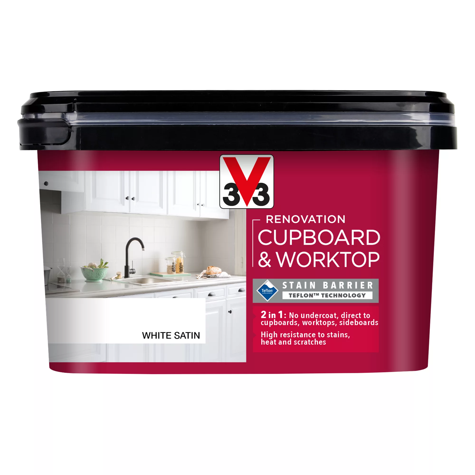 V33 Renovation Cupboard & Worktop paint has been specially developed to renovate high use surfaces. Thanks to a complex combination of exclusive polymers, the paint is extremely durable and resistant to culinary and domestic stains. It allows regular and easy cleaning without altering the colour and finish of the paint.